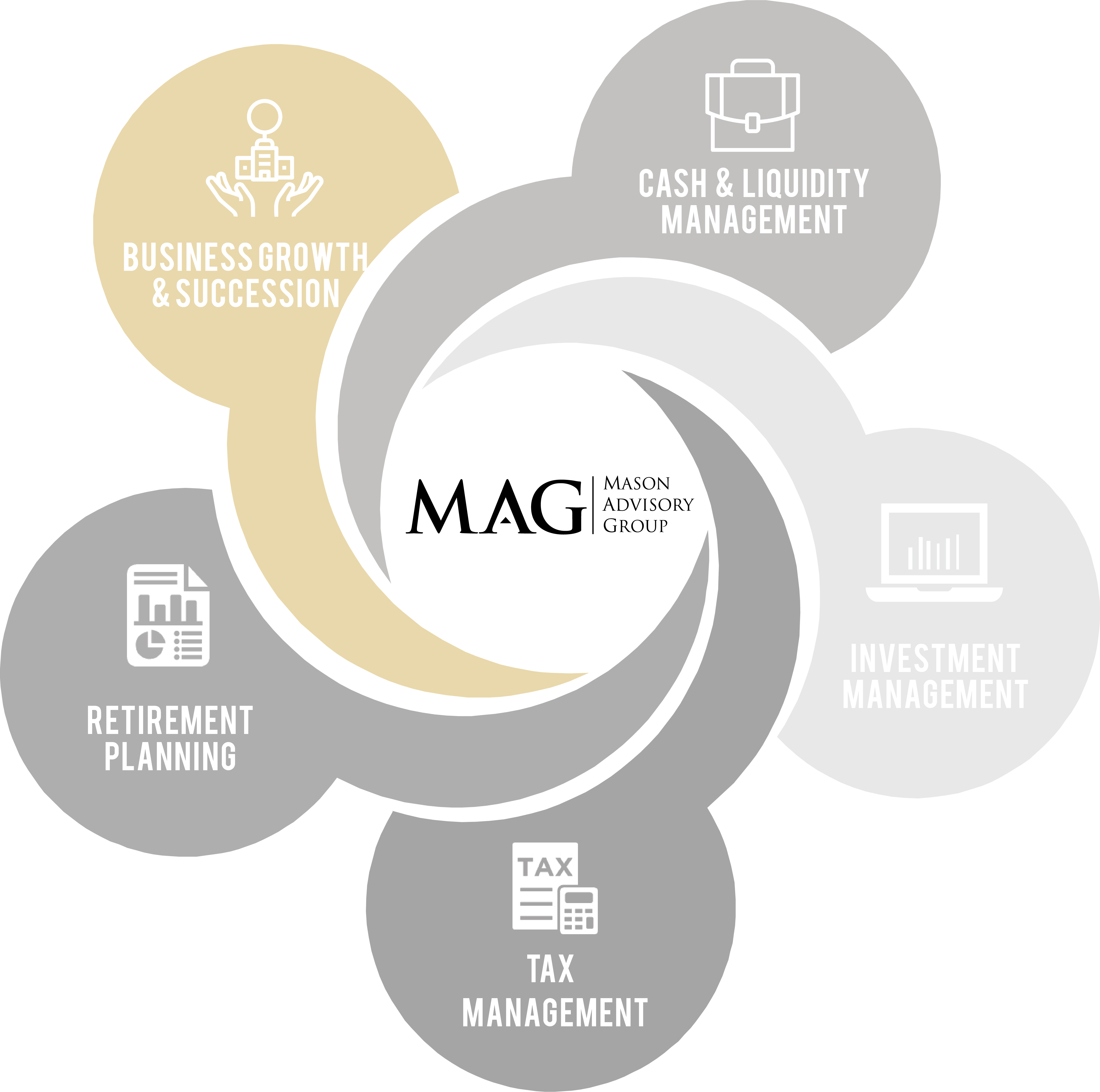 Mason Advisory Group is dedicated to helping you work toward meeting your liquidity needs and work toward building cash reserves to navigate unexpected expenses and fluctuations in business revenue. Through strategic investment of your available cash and the establishment of reliable lines of credit, we help you gain the confidence necessary for you to work toward maintaining and growing your business.