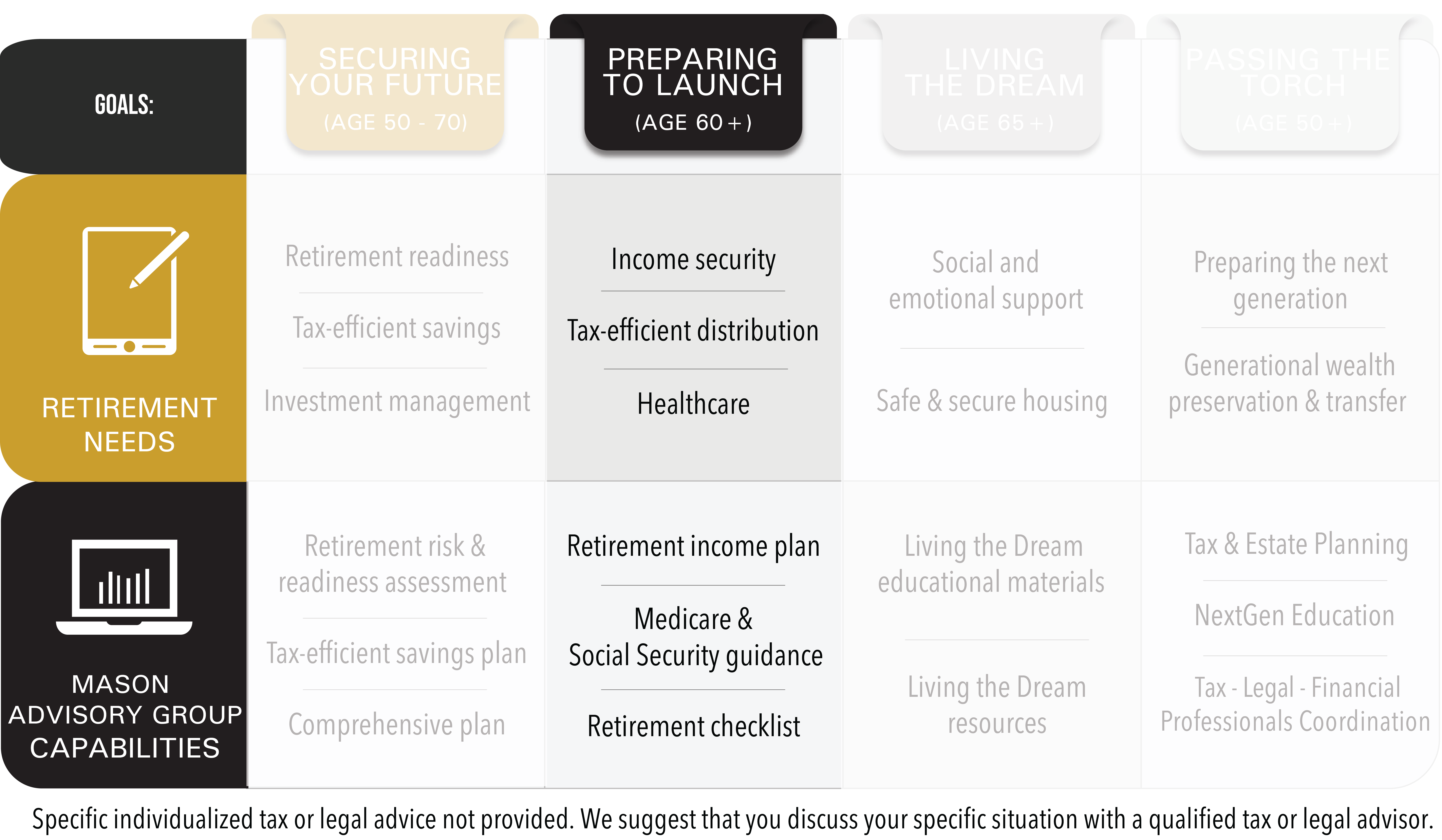 Retirement can be a complex and stressful transition, with numerous decisions, actions, and tasks to manage. With Mason Advisory Group by your side, you can feel confident knowing that you’ll be informed, prepared, and on track with all aspects of your retirement transition. We’re here to help you with the following goals: